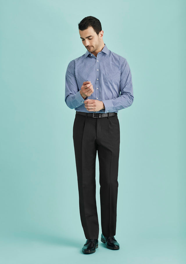 Features: Small front pleats, straight through the leg. Waistband with stretch fusing. Internal security pocket on right front pocket, and two rear pockets.