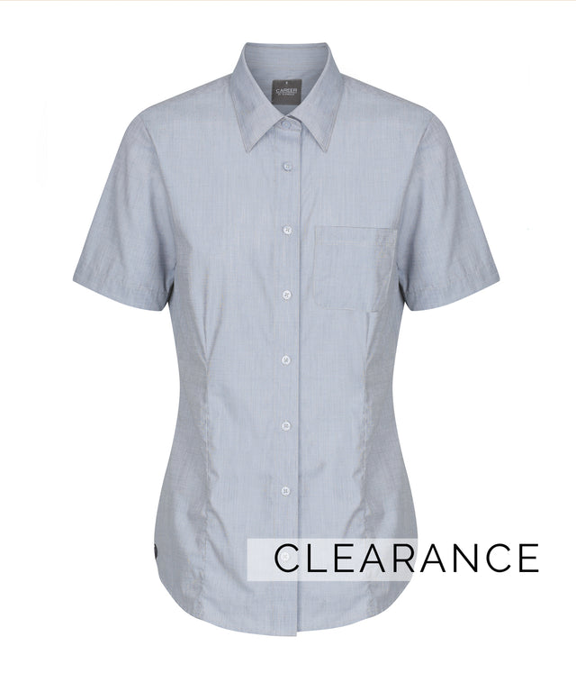 Womens Short Sleeve End On End Shirt, Casual Slim Fit, Double Fold Front, Classic Collar, Contrast Back Yoke Tab, Contrast Under Sleeve Hem Facing, Contrast Side Seam Gussets, Left Chest Pocket