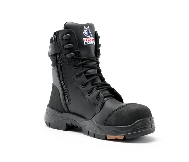 The Tindal boasts innovative boot technology with a 200 joule safety composite toe cap and make toe guard for protection. This men’s 170mm derby, high-leg lace-up style is a popular choice for Mechanics, Sparkies and Factory Hands. The stylish upper design features an industrial-grade zipper for easy on/off. The Tindal has a TPU outsole heat resistant to 130 degrees, has anti-static properties and premium water resistant leather available in black.