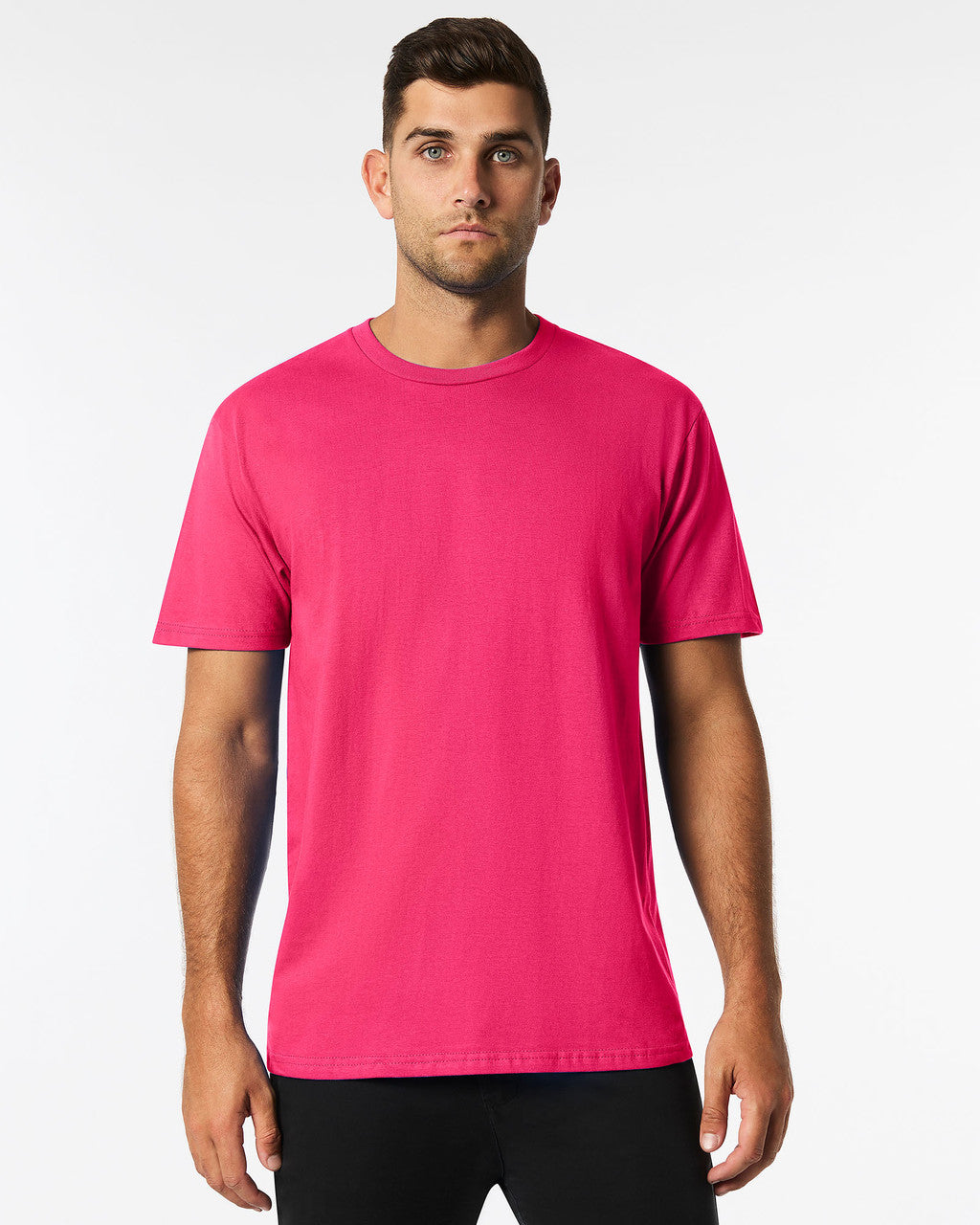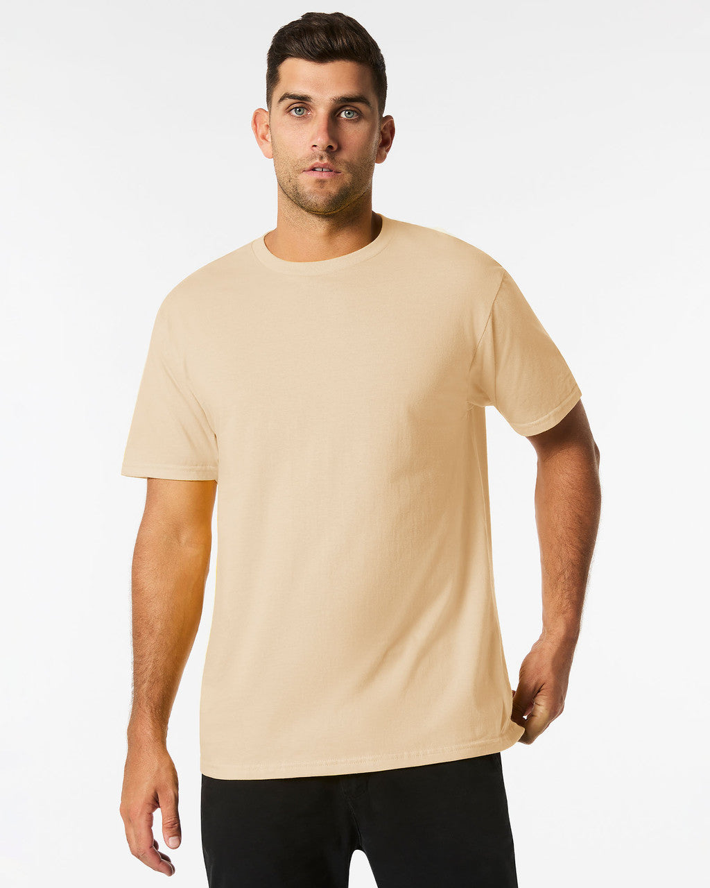 100% Ring Spun Cotton; Features: Softstyle Midweight features high stitch density fabric that offers a smooth printing surface, ideal for DTG, Non-topstitched classic width rib collar, Taped neck and shoulders for comfort and durability, Modern classic fit, tubular body, Black Tear away label