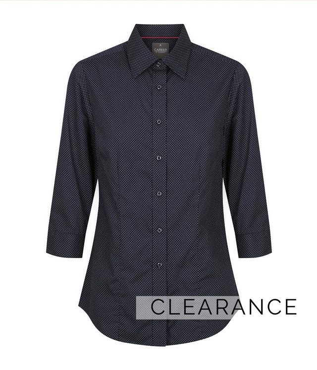 Womens 3/4 Sleeve Dot Print Shirt, Slim Fit, Placket Front, Front & Back Darts, Hidden Modesty Button, Classic Collar, Adjustable Cuff