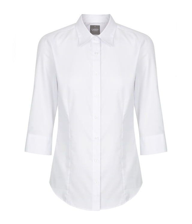 Womens 3/4 Sleeve Ultimate White Shirt, Career Slim Fit, Placket Front, Front & Back Darts, Hidden Modesty Button, Classic Collar, Adjustable Cuff
