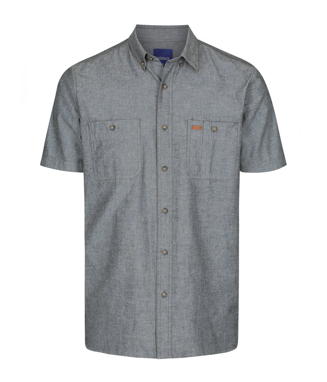 Mens Short Sleeve Industrial Chambray Shirt, Classic 5045 Fit, Placket Front, Button Down Collar, Double Pockets, Tortoise Shell Buttons, Trademark Suede Pen Pocket Detail