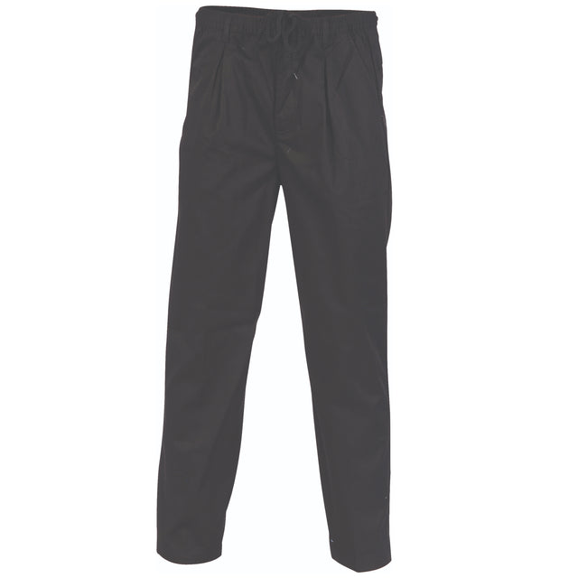Wash-n-wear, elastic drawstring with belt loops and zip fly. 2 side and one back pocket.