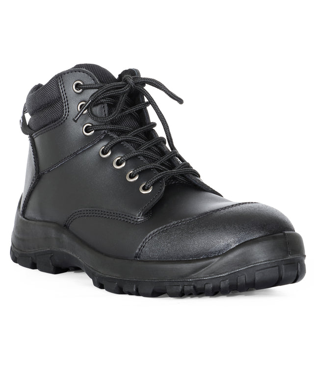 Dual Density PU injection sole construction Fully lined with polyester mesh. Oxford padded tongue, Oxford cushion back 200J impact resistant steel toe cap with embossed leather toe cover Triple stitch at inner and outer sides for durability 7 Nickel eyelets YKK nylon zip Toe kick & ladder grip on outer sole, shock absorbing heel Oil resistant, Anti-static sole SRC slip resistant sole Individually boxed, carton of 5 Meets AS 2210.3:2019 Certified by BSI BMP No 622279