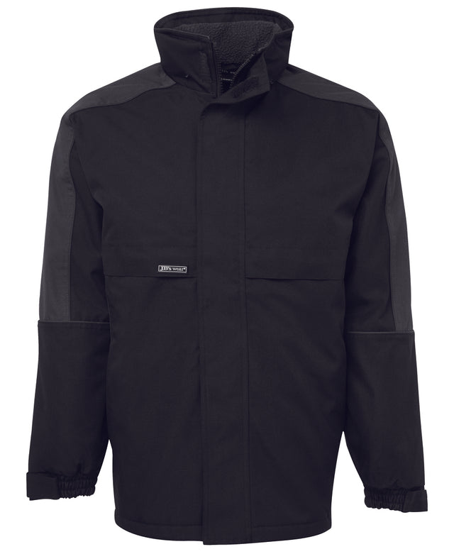 Classic fit 100% Polyester Oxford 450 D Waterproof rating to 8000mm fabric 370gsm shepherd fleece lining Two internal chest pockets and internal mobile phone pocket Two front welt pockets with zipper Embroidery zipper Two waist pockets with zip closure Seam sealed for improved durability Concealed hood