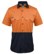 Urban fit 98% Cotton, and 2% Elastane ' 150gsm twill Complies with Standard AS 4399:2020 for UPF Protection (UPF 50+) Complies with Standard AS/NZS 1906.4:2010 and AS/NZS 4602.1:2011 Day Wide back yoke with concealed mesh, cooling gussets at underarms Front chest pockets with button down flaps and pen insert Contrast panel on front and lower back Curved hem with back tail styling Two piece collar