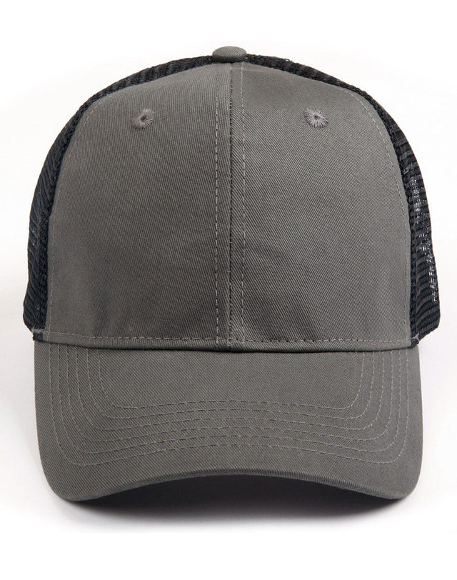 Description: 6 panel pre-curved peak trucker cap. Laid back structured front with back Nylon mesh. Embroidered eyelets. Adjustable fabric velcro closure.CH89 PREMIUM COTTON TRUCKER CAP - Ash/Black is backordered and will ship as soon as it is back in stock.