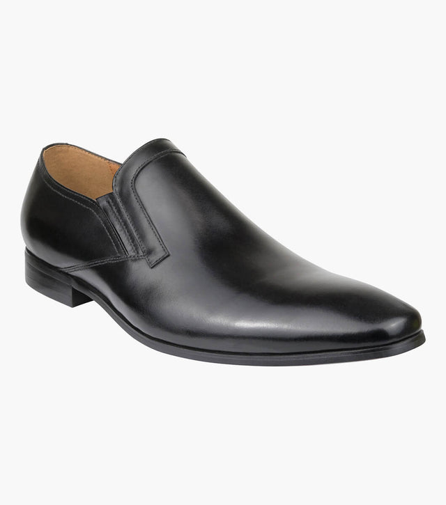The Florsheim Stanton Plain Toe Slip On is a business shoe that features a contemporary tapered toe and a modern stacked heel. With a fully cushioned footbed and padded tongue, it also has two side gussets that not only add personalized fit but a modern design detail as well.