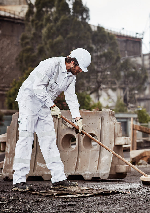 Sizes: 87S - 132S; Fabric: 100% Cotton Drill - 280 gsm; Features: Compliant with Australian night time road work requirements with double hoop leg tape,Bio Motion tape configuration to improve recognition of human shape at distance,Made from durable hard wearing cotton drill,Large cargo pocket with unique side zip pocket built into below,Mobile phone pocket,Two side hip pockets,Two back hip pockets;